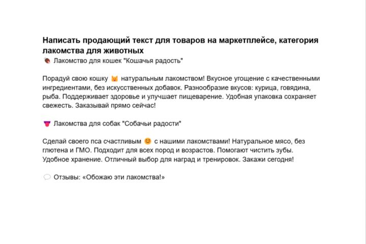 Написать продающий текст для товаров на маркетплейсе, категория лакомства для животных