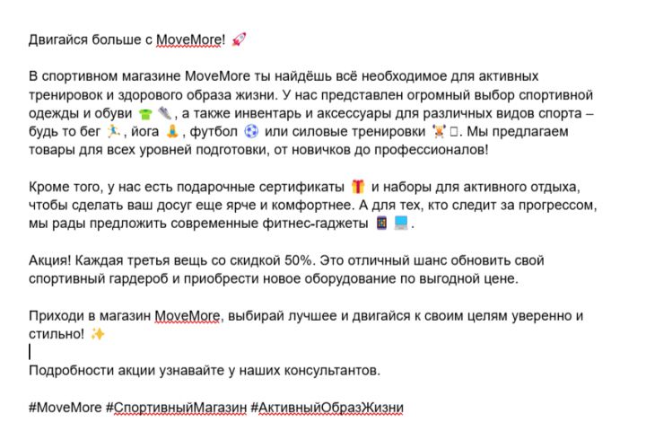 Рекламный текст для спортивного магазина 'MoveMore'. Магазин 'MoveMore' предлагает широкий ассортимент: от спортивной одежды и обуви до инвентаря и аксессуаров для разных видов спорта, подходящих для любого уровня подготовки. В магазине можно найти и подарочные сертификаты, и наборы для активного отдыха, чтобы ваши тренировки были комфортными и стильными. В продаже также популярные фитнес-гаджеты. Обязательно укажите акцию: каждая третья вещь со скидкой 50%! Подробности можно узнать у сотрудников магазина. Текст должен быть длиной от 500 до 700 символов.