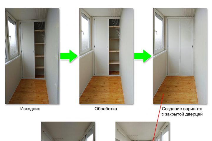 Обработка фотографий шкафов и тумб на балконах. Цветокоррекция, светокоррекция, коррекция перспективы, выравнивание горизонталей, вертикалей, удаление ненужных предметов, придание более презентабельного вида.