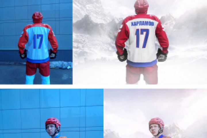 Обработка фото для рекламы на основе референса. Цветокоррекция, ретушь, замена фона, удаление логотипов на форме и клюшке.