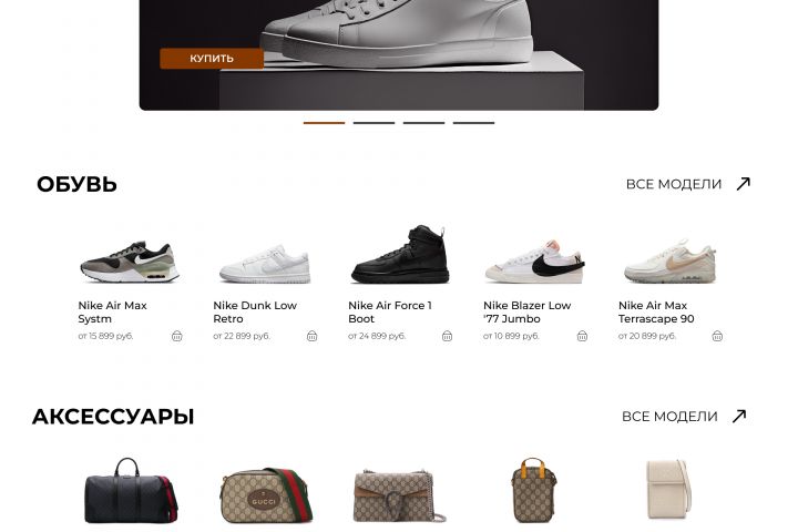 Страница каталога с различными фильтрами по цвету, цене, бренду, размерам и моделям.