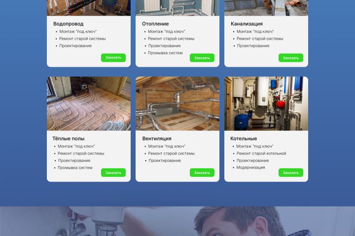 Сделан дизайн макет для сантехнических услуг и товаров с несколькими блоками (шапка, футер, карточки товаров и услуг, слайдер, оффер). Сделан по техническому заданию которое сделано самостоятельно.