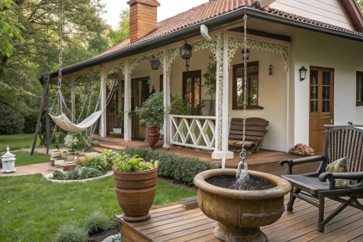 На фотографии изображен уютный уголок для отдыха на открытом воздухе, который гармонично сочетает в себе элементы природы и декора. Белый дом с элементами дерева и кованого железа создает ощущение уюта и комфорта. Зеленые растения вокруг дома добавляют свежести и природной красоты. Гамак, подвешенный между двумя деревьями, предлагает идеальное место для релаксации и наслаждения природой. Плетеное кресло рядом с фонтаном приглашает к спокойному отдыху и размышлениям. Фонтан, возможно, добавляет успокаивающий звук журчащей воды, создавая атмосферу уединения и покоя. В целом, этот дачный интерьер представляет собой идеальное место для отдыха и восстановления сил на природе.