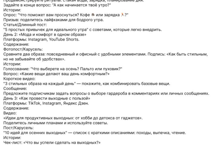 На изображении представлен контент-план для блогера в тематике лайфстайл и саморазвитие на три дня. План включает в себя подробное описание тем, платформ, видов контента и способов взаимодействия с аудиторией для каждого дня.