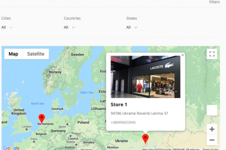 Карта отображает результат фильтрации по продавцам системы Dokan. Динамически подгружаются и удаляются кастомизированные маркеры.