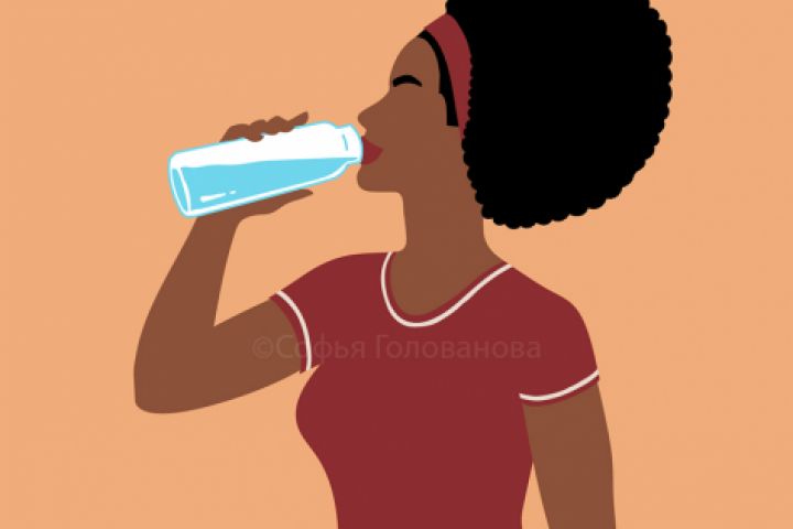 Девушка пьет воду. Иллюстрация в простом стиле без детализации.