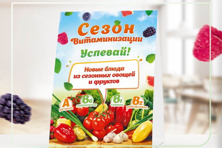 Разработка дизайна концепта «Сезон витаминизации» для кафе и адаптация его под различные форматы: вставку в меню-борд, баннер на прием заказов, тэйбл-тент А5, баннер в ТВ Full HD.