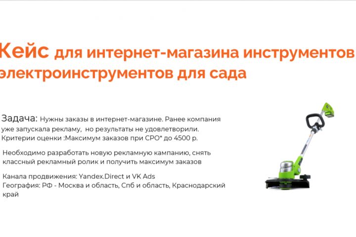 Задача: Нужны заказы в интернет-магазине. Ранее компания уже запускала рекламу, но результаты не удовлетворили. Критерии оценки :Максимум заказов при CPO* до 4500 р.