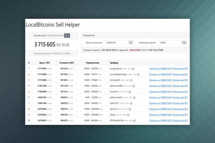 Суть - получаем где-то оплату в битках по определенной цене, и хотим по этой же цене обменять на рубли в обменнике LocalBitcoins.