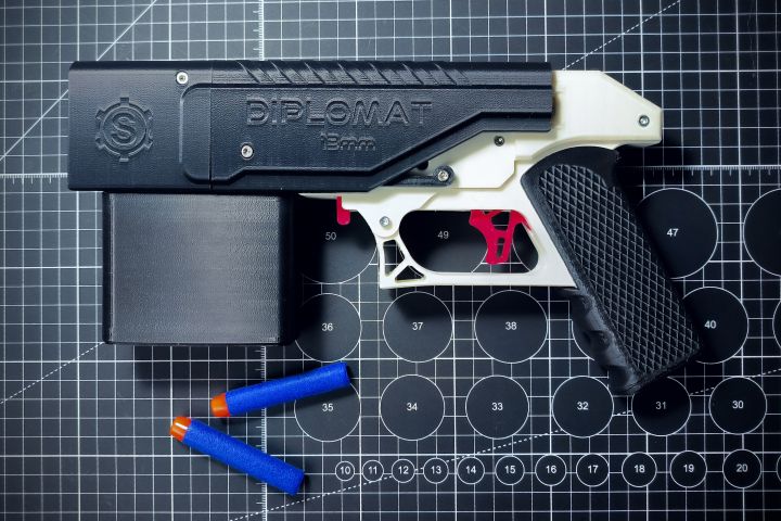 Игрушечный пистолет Nerf. Работа по референсам несуществующих экземпляров. Разработка всех узлов с нуля, включая магазин, механизм подачи, и реечной передачи усилия.
