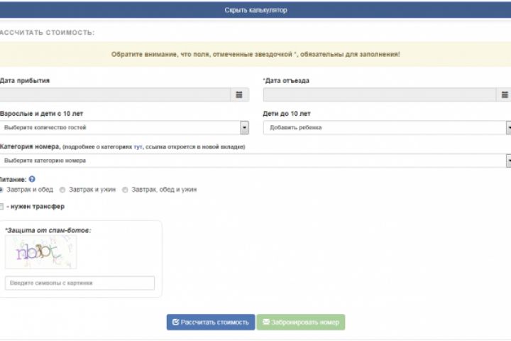 Калькулятор стоимости отдыха в отеле. Если пользователя все устраивает, то по "Забронировать номер" уже введенные данные переносятся в форму бронирования и остается указать только контактные данные и принять оферту. На ajax'е у меня много чего есть, люблю я эту технологию, а это просто одна из мелких работ. На этом же сайте, например, в админке таблицы и многое другое редактируются тоже ajax'ом.