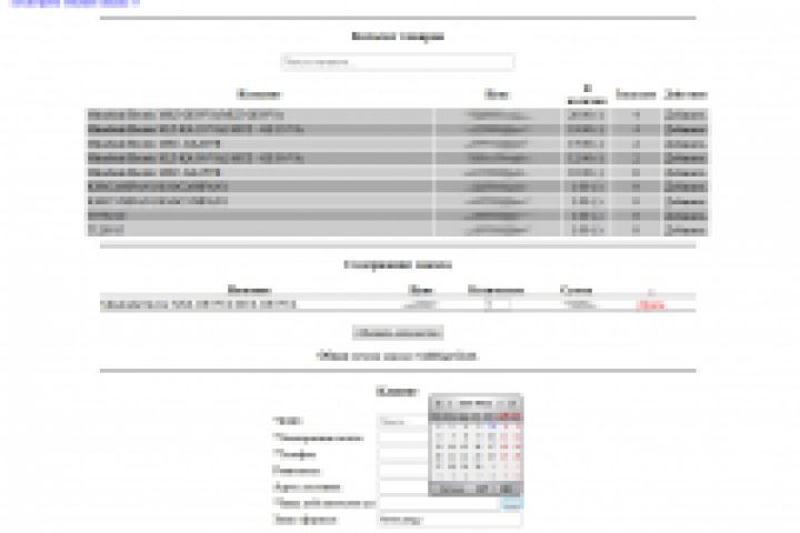 Реализовано с использованием AJAX (php, MySQL, JavaScript). Функциональность: динамически формируемый список товара, который позволяет найти нужную позицию в каталоге простым набором наименования в строке поиска. Товар из списка можно добавить к заказу, списать нужное количество единиц товара (если что-то было продано в торговом зале). Содержимое заказа также формируется и отображается динамически и может быть изменено: количество единиц товара можно увеличивать или уменьшать, позиции можно удалять. Форма ввода данных о клиенте имеет всплывающую подсказку, позволяющую использовать автозаполнение формы в том случае, если клиент уже обращался в компанию. Срок резервирования указывается с помощью календаря. Отдельный скрипт через заданные интервалы времени ищет и удаляет заказы с истекшей датой. Для сформированного заказа доступна генерация счета и накладной в pdf формате.