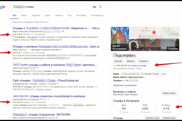 Поисковая выдача Google, по запросу - "название компании" отзывы. Работа по управлению репутацией для компании, город Москва.