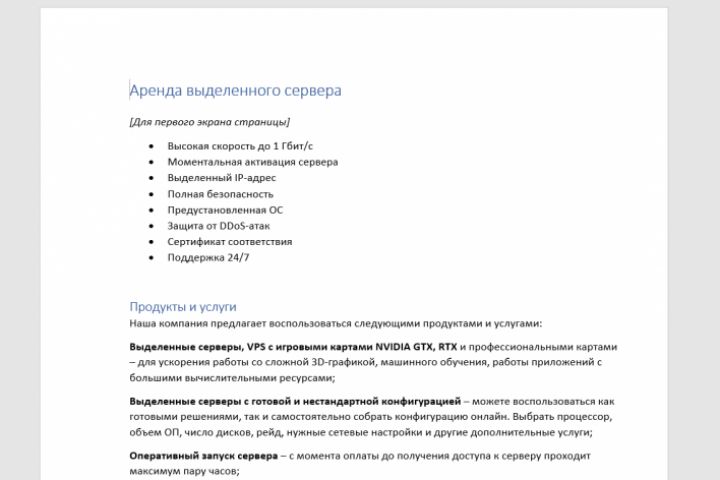 Задача - написать текст для компании, которая занимается предоставлением услуг по аренде выделенных серверов.