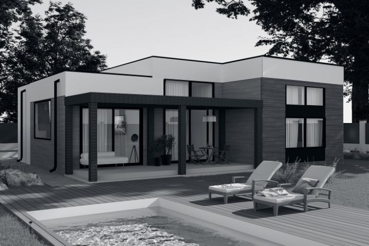 В соответствии с архитектурными планами и чертежами. Выполнена визуализация загородного дома.