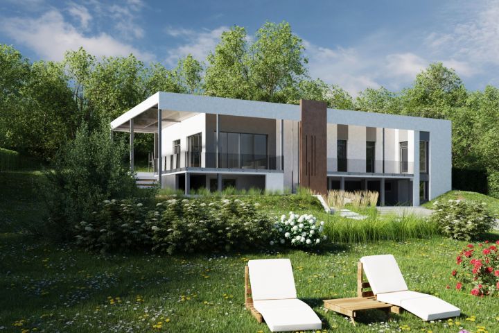 ВИзуализация дома в нормандии по фото готовой коробки в бетоне, по ссылке каталог рендеров, сделанный в итоге.