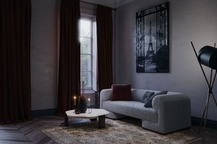 Комната с высокими потолками (3200), метраж - 20 кв. м. Материалы: штукатурка, обои фирмы De Gournay, Керамогранит ITALON SILVER.