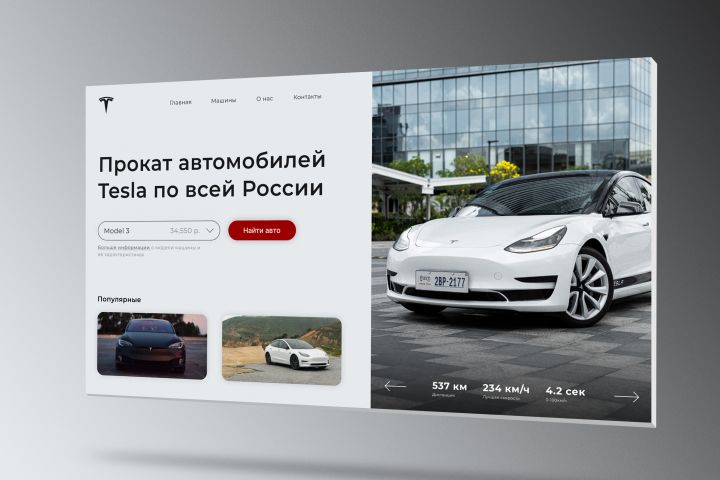 Первый экран сайта "Tesla" Тема: Прокат автомобилей Tesla.