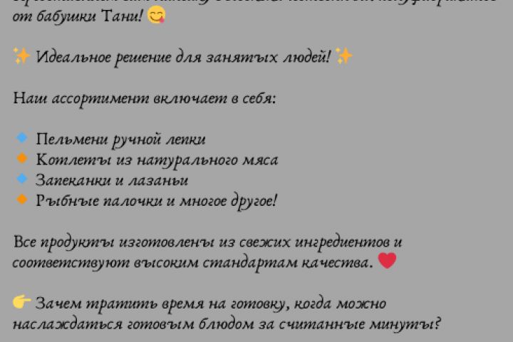 Результатом этой работы стало яркое и привлекательное рекламное объявление, которое эффективно передает ключевые преимущества продукции бренда "бабушки Тани".