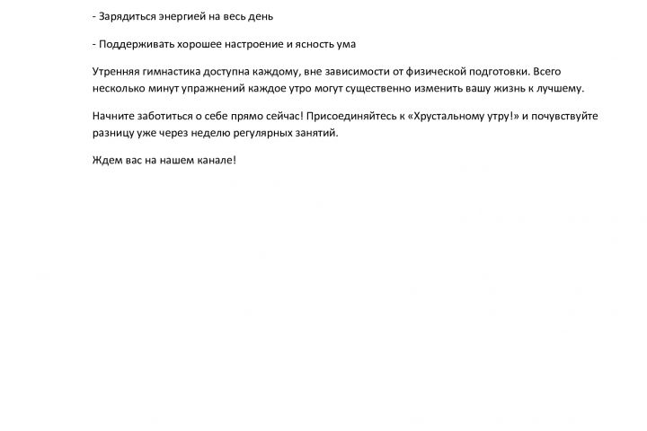 Текст для рассылки в WhatsApp призывающий и вдохновляющий заниматься утренней гимнастикой с каналом "Хрустальное утро!" Задание выполнено при помощи ИИ.