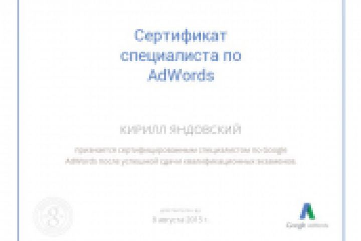 В августе 2014 года, после сдачи 2-х экзаменов, я стал сертифицированным специалистом Google Adwords.