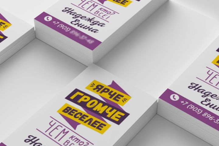 Заказчик: Енина Надежда – ведущая и организатор ярких мероприятий Задача: разработка дизайна персональной визитки. Формат 50х90 мм, односторонняя.