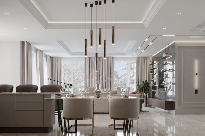Роскошный интерьер с тиле неоклассика. грамотное сочетание естественного освещения и элементов с отделкой золотом создают атмосферу роскоши, а трендовое освещение и обилие элементов из дерева придают обстановке уют. Внимание к деталям-наше кредо!