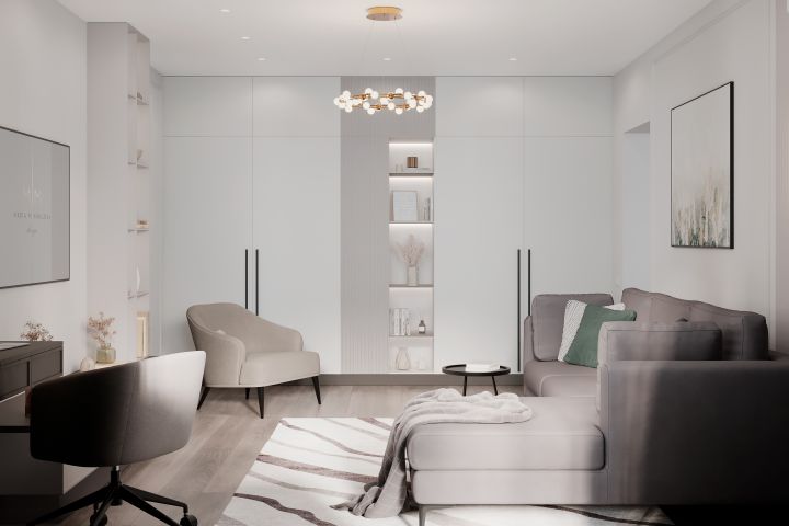 Новый проект выполнен в светлых тонах, а акцентом является золотая отделка в освещении, которая связывает все помещения квартиры воедино. Подобрана мягкая мебели и элементы декора, придающие уют монохромному интерьеру, а функциональность пространства достигнута за счет скрытых систем хранения и открытых ниш.