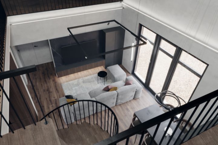Двусветная гостиная в стиле лофт