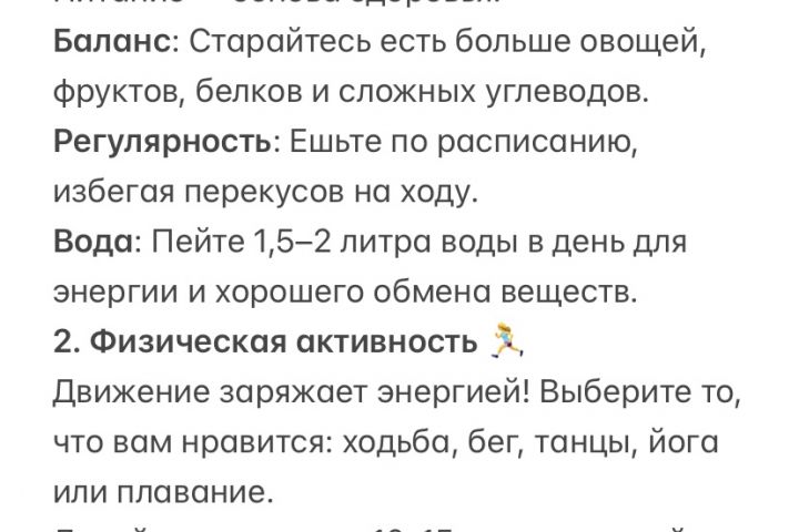 Здоровье — это не только тело, но и душевное спокойствие. Борьба со стрессом важна: найдите способ расслабляться, будь то медитация, прогулки или хобби.