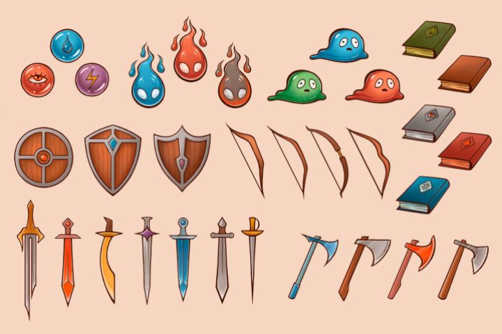 Иллюстрации оружия и дополнительных элементов для карточек в настольной игре.