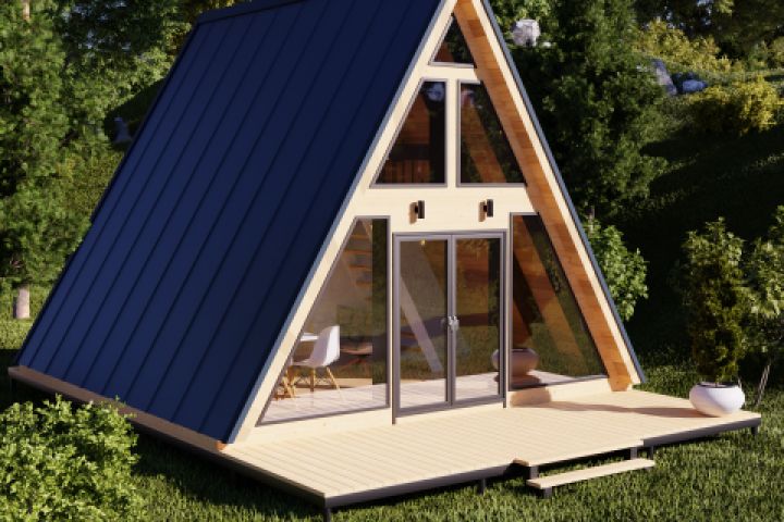 Небольшой А-фрейм домик размерами 6*6 метров, находящийся в лестной местности.