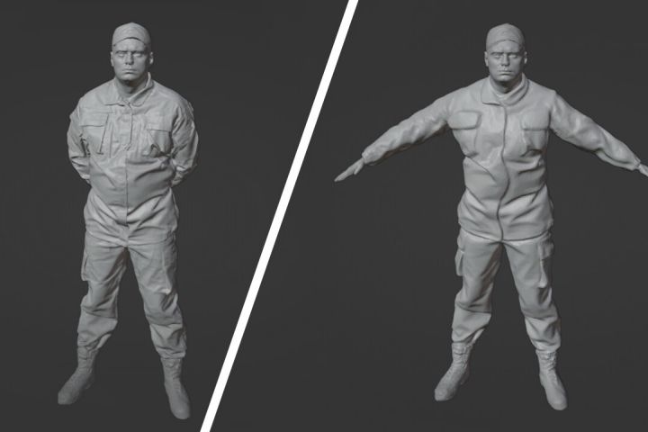 Для одного заказа мне дали модельку человечка, которого надо было поставить в разные позы. Сама по себе расстановка в позы очень быстро делается, и если постараться можно сделать часа за пол. Однако проблема оказалась в том, что этого человечка изначально скульптили не в Т позе, а с руками за спиной. Причём эти руки были слипшимися. Поскольку у меня были очень сжатые сроки (получил я заказ вечером ~в 4 часа, а сдавать надо было уже утром) мне пришлось выложиться на всю, сначала отрезать руки от спины и друг друга, а потом привести их в нормальное состояние. Опыта в скульптинге у меня нет совсем, но отказаться я уже не мог, поэтому пришлось делать. Сделал я её где то за 8 часов без учёта риггинга.