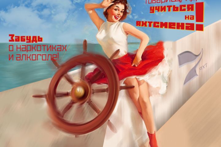 Слоган на банере: « В скучной жизни нужна перемена! Товарищ, иди учиться на яхтсмена! Забудь о наркотиках и алкоголе! Оздоровляйся в парусной школе!»
