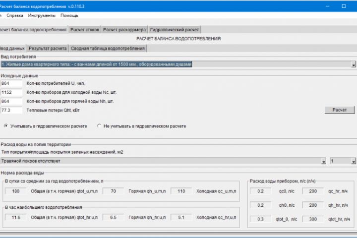 Программа позволяет произвести расчет расходов холодной, горячей воды и стоков потребителя согласно СП 30.13330 "Внутренний водопровод и канализация зданий". Есть возможность сохранения отчета в виде подробного оформленного расчета в формате txt, с указанием формул и пояснений. Так же, в отдельный файл автоматически формируется таблица баланса водопотребления.