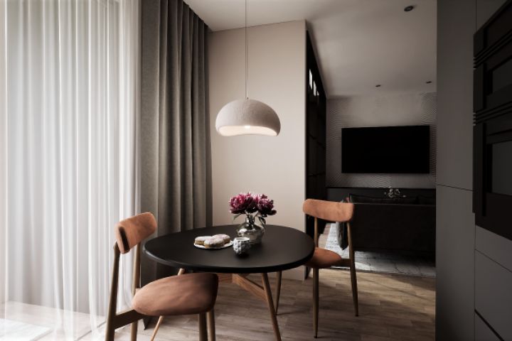 Была выполнена перепланировка квартиры, выдержано монохромное цветовое решение с добавлением пыльных оттенков мятного и перламутрово-оранжевого. Квартира оборудована электрикой и системой "умный дом".