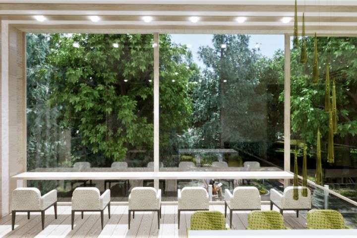 Большая и светлая библиотека в языковой школе, с панорамными окнами, выполнена в двух ярусах. Белый и салатовый цвета дополнены светлой древесиной, что придает воздушность интерьеру.