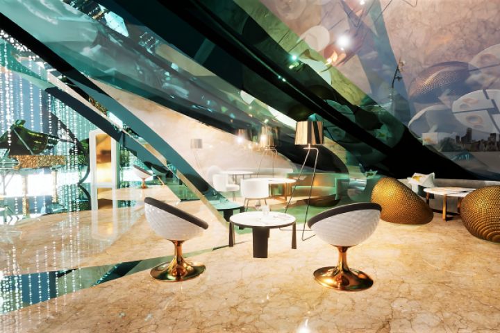 Дизайн проект ресторана на 360 кв.м. исполнен в стиле Арт-деко с элементами бионики. Изумрудный и песочный цвета гармонично дополнены золотой и белой фурнитурой, что придает изысканности интерьеру.