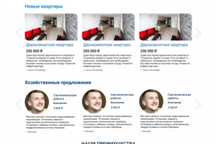 Сервис, позволяющий взаимодействовать арендодателям, арендаторам и хозяйственным работникам. Включает функционал сдачи квартир и подачи объявлений о хозработах, работающие по принципу аукциона, функционал мессенджера, панель администратора и личный кабинет пользователя.