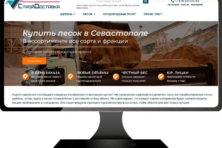 Был заказан сайт для компании, занимающейся оптовой продажей сыпучих стройматериалов в Севастополе. Также, необходимо было разработать логотип, создать слайдер с перечнем продаваемых материалов и добавить достаточное количество текстового контента. Сайт реализован на CMS WordPress.