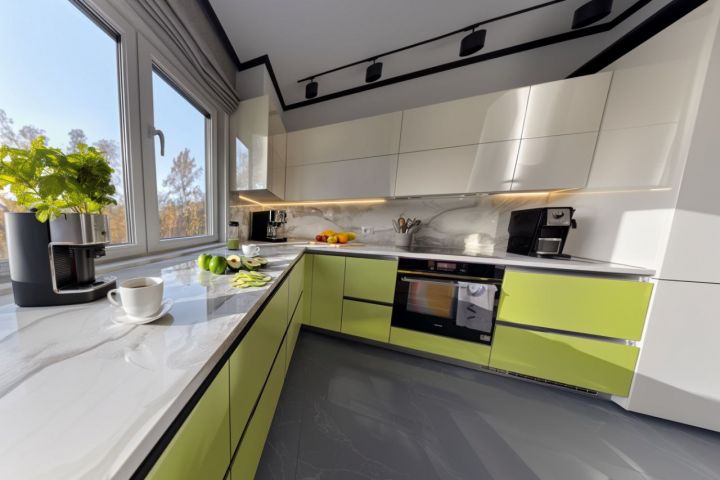 дизайн кухни в белых и фисташковых тонах с красивой столешницей