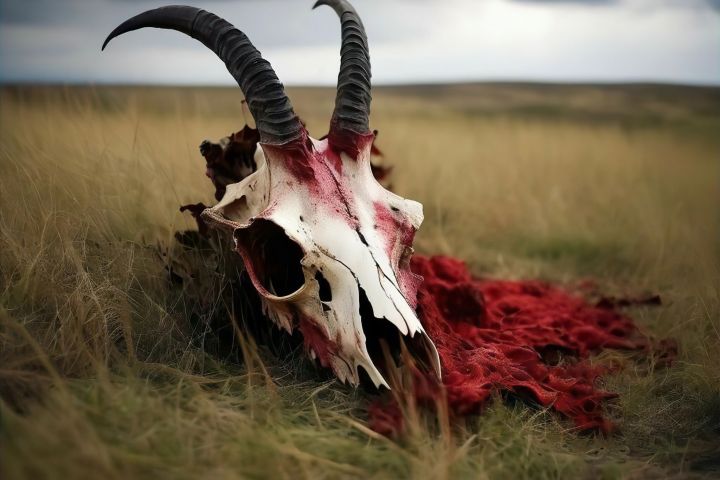 Сгенерировано с помощью ИИ в Шедевруме по запросу: череп козла небрежно лежит на траве в степи.