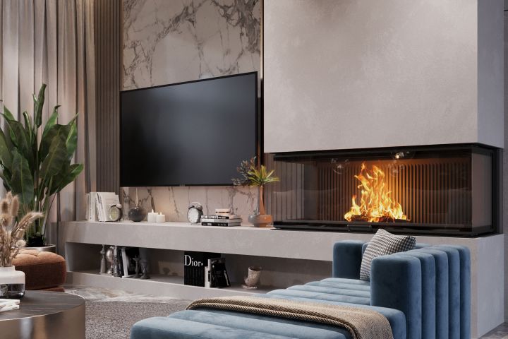 Система хранения интегрирована в низкую тумбу, над которой расположена ТВ-зона с отделкой из натурального мрамора. Встроенный биокамин создаёт уют и атмосферу без лишних технических сложностей. Рядом — мягкая группа с акцентным креслом цвета индиго и журнальным столом.