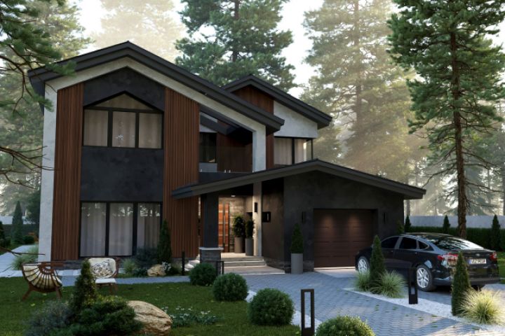 Отделка дома выполнена фасадной штукатуркой и декингом. Из общих пространств и из спальных помещений есть выходы на террасу и балкон. Некоторые окна дома выполнены угловыми без наружных опор, что создаёт для хозяев дома большой обзор и освещенность помещений.