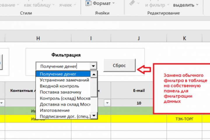 На лист добавлены (в виде отдельной панели) выпадающий список и кнопка. При выборе элемента в списке выполняется фильтрация всей таблицы. При нажатии кнопки "Сброс" фильтры сбрасываются.