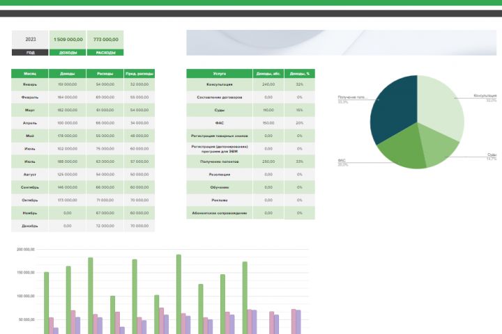 Несколько взаимосвязанных таблиц для ввода доходов, расходов, клиентов, и вывод на информативный лист с графиками.