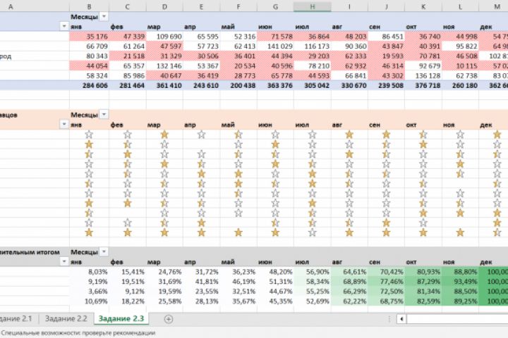 В задании необходимо было воспроизвести результат, данный заказчиком на картинке. Было выполнено условное форматирование (с формулами) для трех таблиц и достигнута полная идентичность вида.
