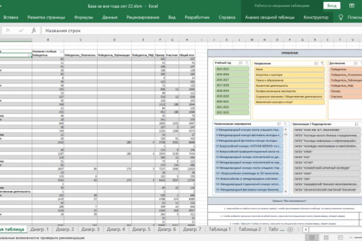 - создание 11 дополнительных сводных таблиц по отдельным показателям (7 штук – для построения диаграмм, 4 штуки – для проведения анализа);