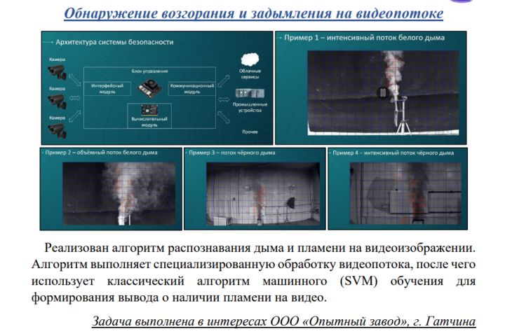 Реализован алгоритм распознавания дыма и пламени на видеоизображении. Алгоритм выполняет специализированную обработку видеопотока, после чего использует классический алгоритм машинного (SVM) обучения для формирования вывода о наличии пламени на видео.