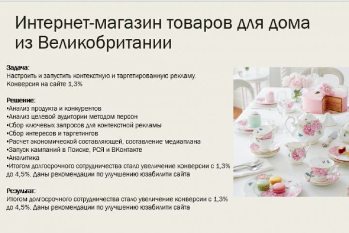 Небольшой нишевый интернет-магазин английской посуды. В рамках проектах был проведен анализ конкурентов, подготовлена и запущена контекстная реклама и реклама в VK.
